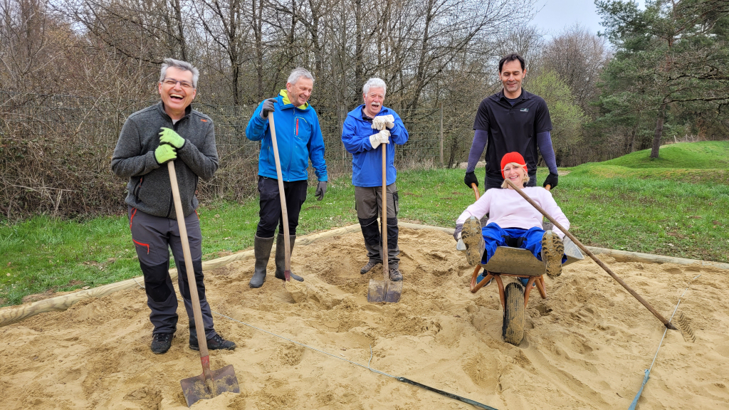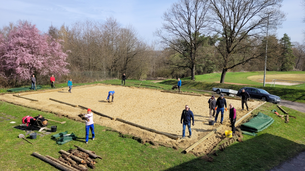 Mit vereinten Kräften wurde zunächst die alte Umrandung entfernt. Danach ging es an die mühevolle Feinarbeit: Der Sand wurde von Hand gesäubert und so gut wie möglich von Holzsplittern befreit. Anschließend konnten die neuen Balken verlegt und das Spielfeld wiederaufgebaut werden. Dabei war erneut ordentlich Muskelkraft gefragt, denn große Mengen Sand mussten bewegt und gleichmäßig verteilt werden, um das Feld optimal für die kommende Saison vorzubereiten.